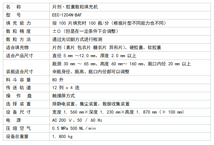 川越片劑·膠囊數(shù)粒填充機(jī)采用日本尖端技術(shù),搭載雙重檢測傳感器對各類片劑/膠囊產(chǎn)品進(jìn)行精確計(jì)數(shù),實(shí)現(xiàn)100%零誤差。同時,通過時序閥門控制實(shí)現(xiàn)快速填充,品種登錄可以達(dá)到200種,成為全球行業(yè)首選。